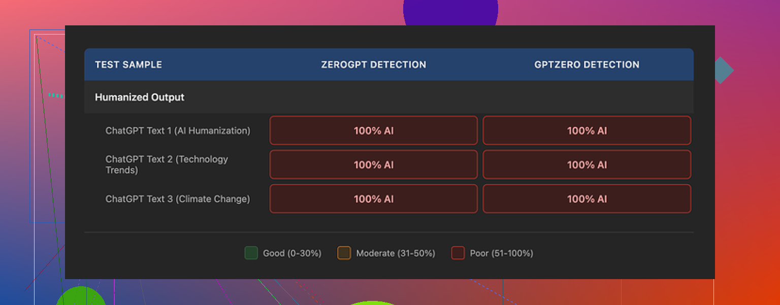 Every single humanized output I tried came back as 100 percent AI on all three. Not 60, not 80, full 100.
