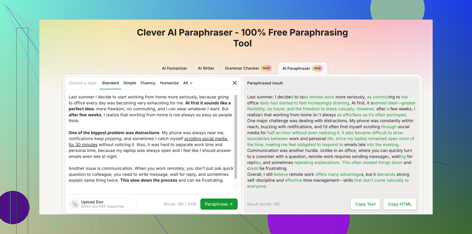 If you just need something “reliable” for school, a mix of your own rough draft + a tool like Clever AI Humanizer on tricky paragraphs + your final edit is usually enough. Not perfect, but way safer and more natural than depending 100% on a free paraphraser and hoping no one notices.