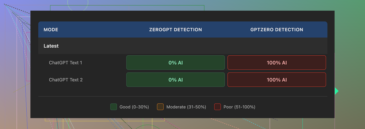 I pushed the outputs through two detectors that people actually use: ZeroGPT and GPTZero.