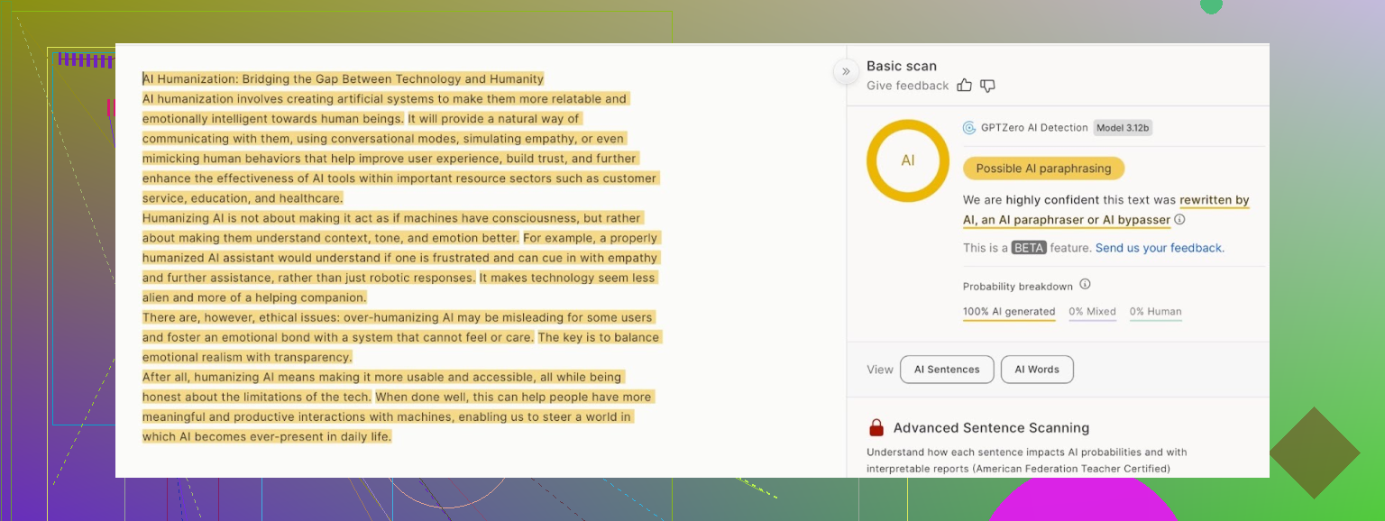 GPTZero? Keine Chance. Sieht sofort, dass es KI ist. Auch das Vorspielen von “schreib wie ein Mensch” hilft nicht: Die Detektoren achten offenbar auf den Schreibfluss und nicht nur auf Wortwechsel.