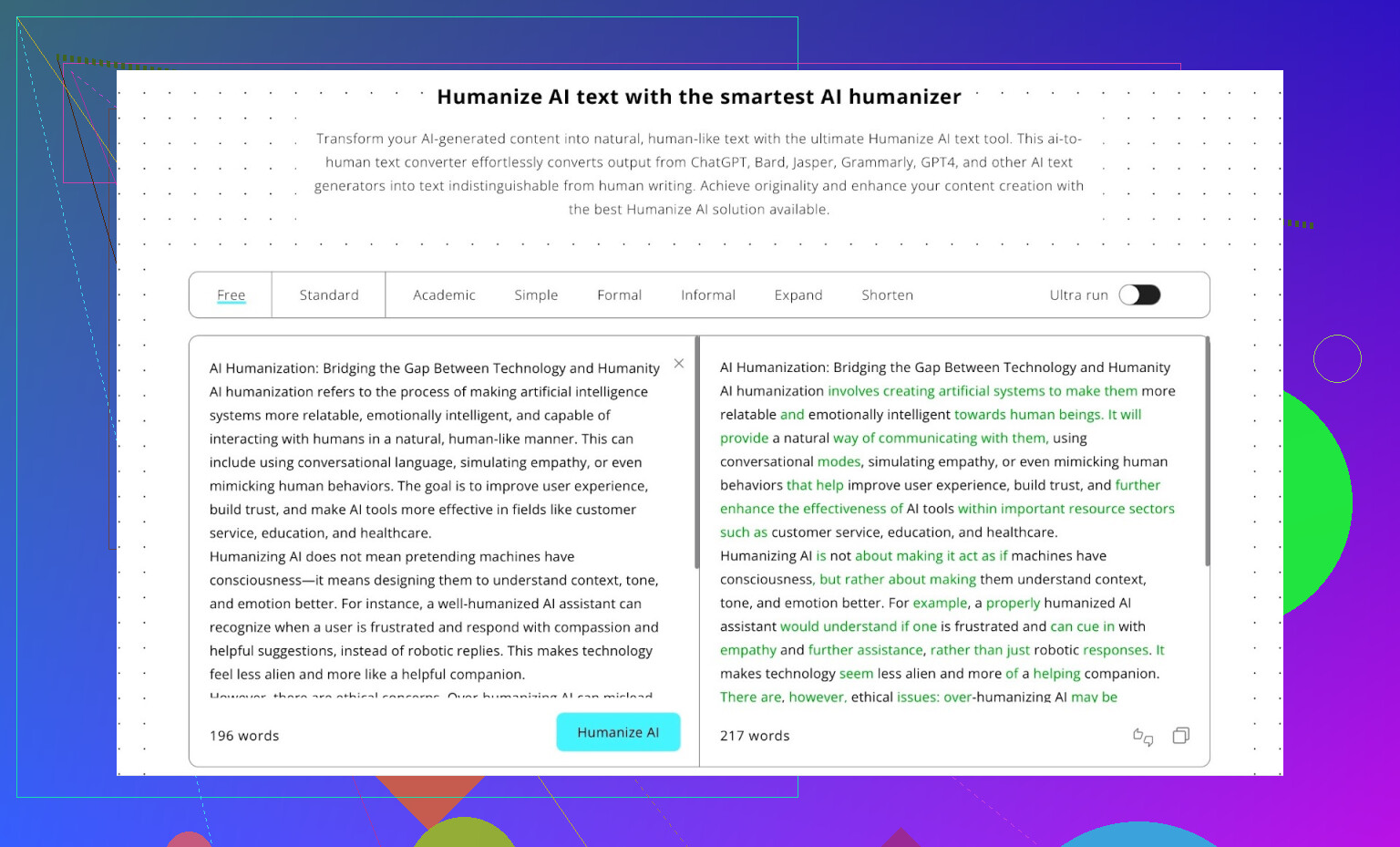 Noch was: Wer kreativ arbeitet (z. B. Fiction, Blog, Marketing), sollte unbedingt Persönlichkeit reinbringen – Ironie, Sarkasmus oder vielleicht sogar mal einen Tippfehler. Genau damit hat KI meistens echte Probleme. Algorithmen merken das nicht unbedingt, aber echte Leser schon. Wenn’s nur darum geht, Schul-Detektoren zu umgehen, reicht Clever Ai Humanizer mit einem kurzen manuellen Korrekturlauf meistens.
