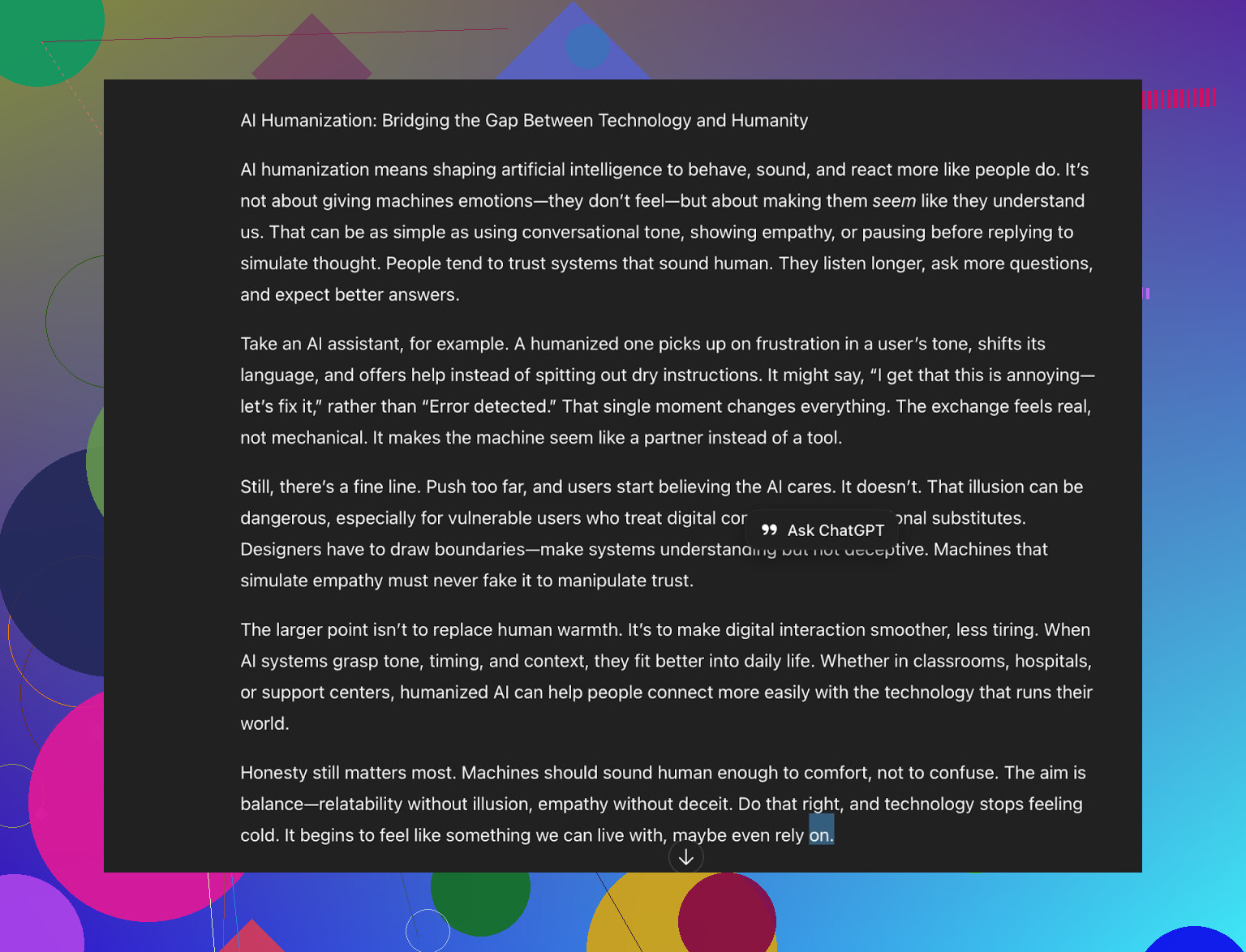 Deshalb mein Vorgehen: Clever Ai Humanizer erledigt die Vorarbeit, dann prüfe ich selbst auf seltsame Formulierungen oder unpassenden Ton und passe das nach. Wer’s noch besser will, sollte den Text laut vorlesen (alles, was unangenehm klingt, taugt nicht), oder eine Freundin bzw. einen Freund zum Testlesen bitten. Und falls jemand ein Tool findet, das wirklich echten Humor, Schlagfertigkeit oder wirkliche Gesprächsenergie (und nicht nur gezwungene „persönliche Akzente“) einbringt – bitte teilen. Diese Zutat fehlt bisher komplett.